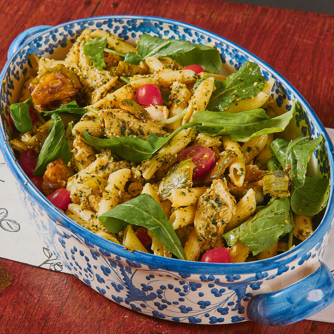 Massa Penne Italiana refogado com molho pesto (amêndoas, queijo parmesão, manjericão, azeite extra virgem, pimenta do reino, alho e sal) acrescida de um delicioso filé de frango selado com azeite e manteiga, com um toque de cebola, alho, tomate-cereja e abobrinha italiana e finalizado com folhas de manjericão.